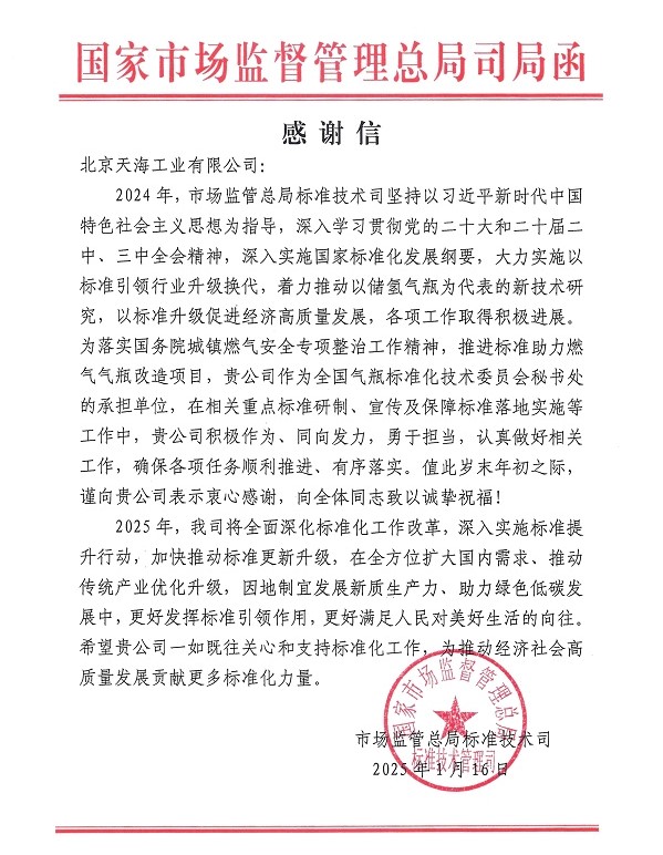 <div class="con">近日，天海工业收到来自国家市场监管总局标准技术司的感谢信。信中写道，天海工业作为全国气瓶标准化技术委员会秘书处承担单位，在相关重点标准研制、宣传及保障标准落地实施等工作中积极作为、同向发力，勇于担当，认真做好相关工作，确保各项任务顺利推进、有序落实，对此表示衷心感谢，这是对天海工业工作的极大肯定和鼓舞！        天海工业致力于气体储运装备的技术研究和产品开发，全力支持全国气瓶标准化技术委员会工作，积极参与标准的制修订工作，牵头或参与制修订国家标准43项、地方标准3项、行业标准1项、团体标准28项，为行业标…</div>